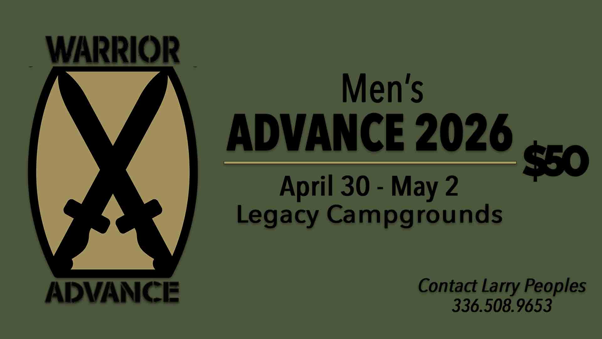 Men, mark your calendars for April 30th - May 2nd for our Men's Warrior Advance at Legacy Campground. Join other men for a time of service, ministry and recreation. Cost is $50 which includes lodging and meals. For more info, contact Larry Peoples at 336.508.9653. |