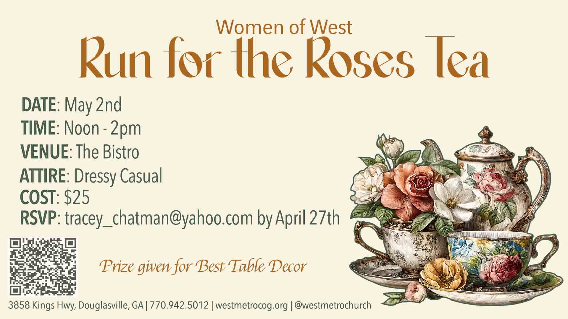 Women of West are having a Run for the Roses Tea on Saturday, May 2nd, from Noon to 2pm in The Bistro. Attire is Dressy Casual; wearing of hats or fascinators is encouraged. There will also be a prize for the best table decor. Cost is $20. Payment can be made via our Donations page… |